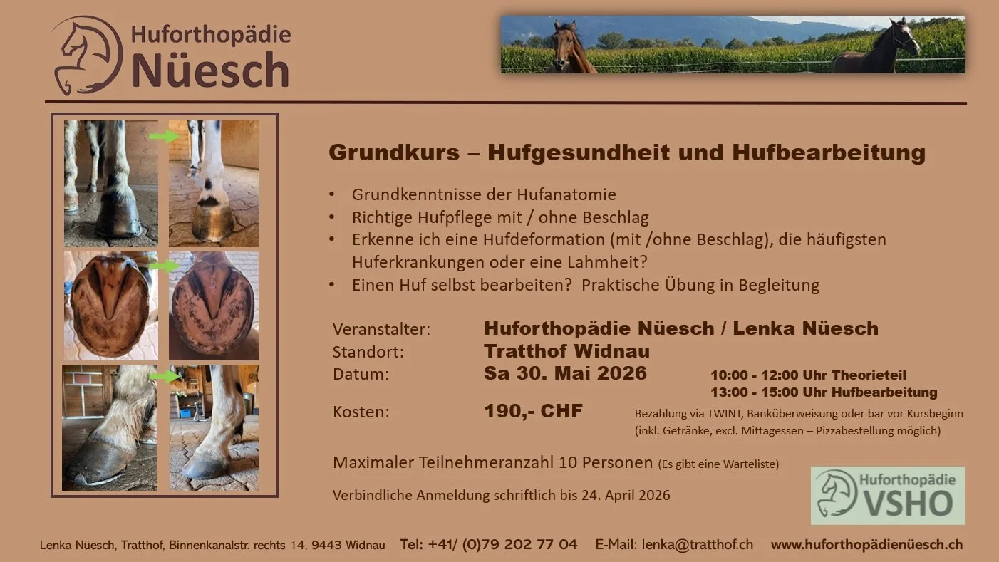 Heute verfüge ich über eine kantonale Bewilligung für die gewerbsmässige Hufpflege für Equiden und bin Mitglied des Verbands der Schweizer Huforthopäden (VSHO)